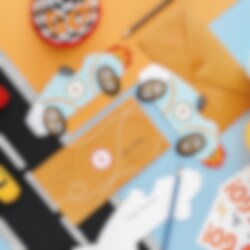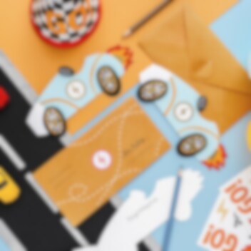 Erittäin hienot ja ylelliset kutsukortit, jotka sopivat täydellisesti lastenjuhliin autoteemalla. Näiden muotoiltujen kutsukorttien koko on 19 x 8,5 cm.