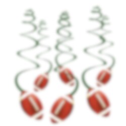 6 kpl. riippuvia koristeita hienoilla kuvioilla amerikkalaisesta jalkapallosta. Koristeet ovat noin 60 cm pitkiä ja niissä on kuvioita molemmilla puolilla. Ne on valmistettu pahvista.