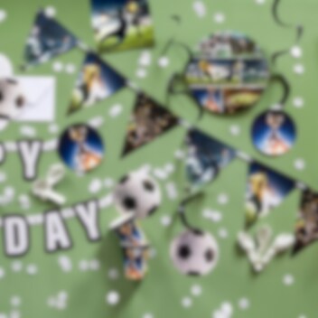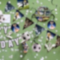 Koristele jalkapallojuhlatila tällä koristeellisella lippuviirinauhalla, joka on tehty pahvista. Siinä on hienoja jalkapalloaiheisia kuvia. Tämän viirinauhan pituus on jopa 4 metriä. Siinä on 15 viiriä, jotka luovat juhlavan tunnelman.