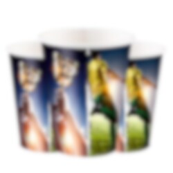 8 kpl. pahvimukeja hienolla jalkapallokuviolla. Mukien korkeus on 10 cm ja tilavuus 250 ml.
