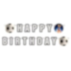 Pahvinen viirinauha kauniissa väreissä jalkapalloteemalla ja tekstillä "Happy Birthday". Viirinauha on 180 cm pitkä ja kirjaimet ovat noin 13,5 cm korkeita.