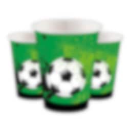 8 paperimukia jalkapalloilla vihreällä taustalla. Kiva lisä kattaukseen juhlissa. Mukit ovat n. 10 cm korkeita ja tilavuudeltaan n. 250 ml.