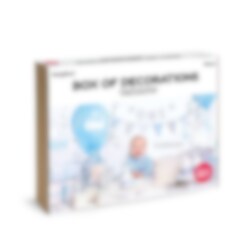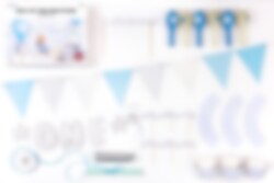 Tämä sinisen ja hopean sävyinen valmispakkaus 1-vuotisjuhliin sisältää 6 kpl cupcakewraps; 1kpl kimaltavan hopean kakkukoristeen; 1 kpl paperisen lippuköynnöksen, väreinä valkoinen, sininen ja hopea, pituus 1.3 metriä; 1 kpl paperisen lippuköynnöjsen kimaltavalla hopealla "One" tekstillä; 6 kpl ilmapalloja, väreinä sininen ja valkoinen; 10 kpl sini-valkoraidallisia paperijuomapilleja; 6 kpl hopeita kimaltavia juhlatikkuja; 1 kpl sininen lahjanauha ja 1 kpl hopeaa serpentiiniä.