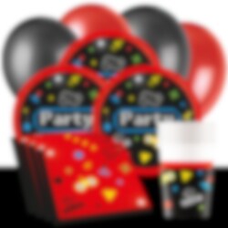 Valmis juhlasetti, joka sisältää lautaset (23 cm), pahvimukeja (200 ml) ja servetit (33 x 33 cm) 8:lle, 16:lle tai 24:lle henkilölle. Näiden lisäksi mukaan kuuluu 10 kpl mustia ja 10 kpl punaisia ilmapalloja sekä mustat muovinen pöytäliina ( 137 x 274 cm). 24 henkilön settiin kuuluu 2 pöytäliinaa.