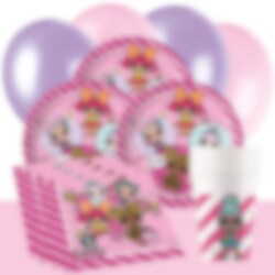 Valmis juhlasetti, joka sisältää lautaset (23 cm), pahvimukit (200 ml) ja servetit (33 x 33 cm) 8:lle, 16:lle tai 24:lle henkilölle. Näiden lisäksi mukaan kuuluu 10 kpl violetteja ja 10 kpl vaaleanpunaisia ilmapalloja sekä punainen vaaleanpunaiset pöytäliina ( 137 x 274 cm). 24 henkilön settiin kuuluu 2 pöytäliinaa.