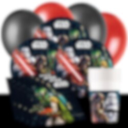 Valmis juhlasetti, joka sisältää lautaset (23 cm), pahvimukeja (200 ml) ja servetit (33 x 33 cm) 8:lle, 16:lle tai 24:lle henkilölle. Näiden lisäksi mukaan kuuluu 10 kpl mustia ja 10 kpl punaisia ilmapalloja sekä mustat muovinen pöytäliina ( 137 x 274 cm). 24 henkilön settiin kuuluu 2 pöytäliinaa.
