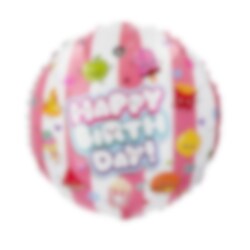 Luo leikkisä ja värikäs juhlatunnelma tällä pyöreällä Kawaii-teemaisella folioilmapallolla. Ilmapallossa on teksti Happy Birthday, ja sitä koristavat söpöt hedelmä-, välipala- ja herkkukuvat, mikä tekee siitä viehättävän koristeen lasten synttärijuhliin.