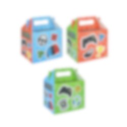 Upea juhlarasia, jossa on kolme erilaista Gaming Party -kuviota. Täydellinen makeisille ja leluille juhliin. Juhlarasia on valmistettu pahvista ja se on helppo taittaa kokoon.