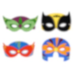 Neljä erilaista hauskaa supersankarinaamiota, jotka on valmistettu pehmeästä vaahtomateriaalista. Voit pukeutua ystäviesi kanssa supersankareiksi synttäreilläsi. Naamiot ovat mukavia ja niissä on kuminauhakiinnitys. Myydään kappaleittain satunnaisessa järjestyksessä.