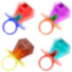 Erivärisiä timantteja esittävät sormukset. Laita nämä juhlapusseihin tai -rasioihin, kun on synttäreiden aika. Sormukset on saatavana neljällä eri maulla: Vadelma, mansikka, kola ja mustaviinimarja. Sormukset myydään lajittelemattomina ja kappaleittain.