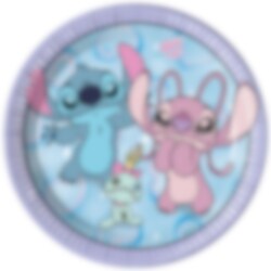 8 kpl pahvilautasia suloisella Stitch ja Angel -kuvalla Lilo & Stitch -elokuvasta. Lautasissa on pehmeä, pastellinen design liilassa ja sinisessä sävyssä, jossa nämä kaksi hahmoa jakavat valokeilan.