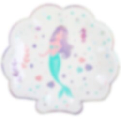 Lautaset ovat valkoiset ja niissä on hopeanväriset folioreunat sekä kuva hienosta merenneidosta värikkäiden kasvien ja simpukoiden ympäröimänä.