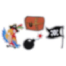 Siisti puinen konfetti aarrearkkuteemalla, merirosvolipulla ja muilla tyylikkäitä merirosvoihin liittyvillä yksityiskohdilla. Hieman ylellisempi konfetti, jota voidaan käyttää uudelleen. Konfetit ovat noin 5 x 6 ja 2,5 x 5,5 cm kokoisia, ja niitä on pussissa yhteensä 10 kappaletta.