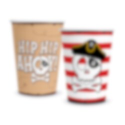 Kata pöytä vauhdikkaisiin merirosvosynttärijuhliin näillä juhlallisilla pahvimukeilla klassisella merirosvoteemalla. Mukeissa on kaksi erilaista kuvaa, toinen tekstillä "Hip Hip Ahoy!" taustalla, joka muistuttaa aarrekarttaa, ja toinen pääkallolla, merirosvohatulla ja punaisilla raidoilla, mikä tekee niistä tyylikkään ja leikkisän yksityiskohdan juhlapöytään.