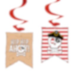 Luo juhlava merirosvotunnelma huoneeseen näillä klassiseen merirosvoteemaan sopivilla riippuvilla swirl-koristeilla. Kiiltävät punaiset spiraalikoristeet yhdistyvät koristeellisiin kuviin, kuten tekstiin "Hip Hip Ahoy!" ja pääkalloon merirosvohattuineen, mikä tekee niistä todella hienon lisän merirosvosynttärijuhlille.