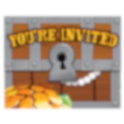 8 kpl hienoja aarrearkkuja esittäviä kutsukortteja tekstillä "You're invited". Kortit ovat kooltaan n, 13,5 x 11 cm. Pakkaus sisältää lisäksi 8 kpl oransseja kirjekuoria.