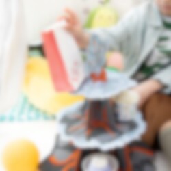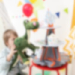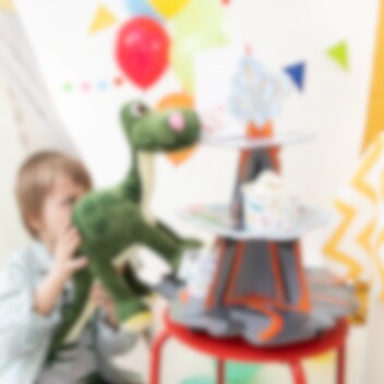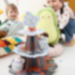 Räjäytä juhlatunnelma kattoon tämän ainutlaatuisen tulivuoriteemaisen muffinssitelineen avulla! Kolme kerrosta ja vaikuttava tulivuoren huippu – täydellinen keskipiste jälkiruokapöytään. Teline on 43 cm korkea ja 34 cm leveä. Se sopii erinomaisesti muffinien, kuppikakkujen tai muiden herkkujen tarjoiluun näyttävällä tavalla. Täydellinen dinosaurusjuhliin ja seikkailuteemoihin!