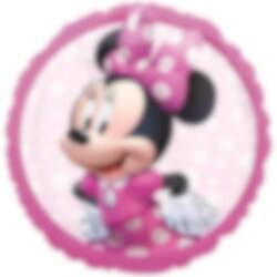 Vaaleanpunainen folioilmapallo Minni Hiiren kuvalla keskellä. Suloinen koriste juhlahuoneeseen laitettavaksi ennen kuin on aika Minni Hiiri -synttäreille. Ilmapallon halkaisija on 43 cm täytettynä ja se täytetään ilmalla tai heliumilla.