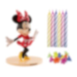 Nätti koristelusetti joka sisältää Minni Hiiren sekä 10 kpl pastellinväristä kakkukynttilää ja pidikettä. Aseta kynttilät ja Minni Hiiri kakun päälle. Minni on noin 9 cm pitkä ja kynttilät noin 6,5 cm korkeita. Näitä koristeita ei voi syödä, ne ovat ainoastaan tarkoitettu koristeiksi.