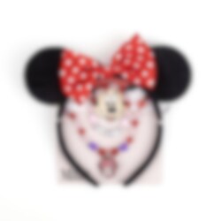 Luo leikkisä ja klassinen ilme tällä ihanalla Minni Hiiri -korusetillä! Setti sisältää mustan diadeemin, jossa on pyöreät korvat ja Minnin ikoninen punainen rusetti valkoisilla pilkuilla. Siinä on myös värikäs helmikoru, jossa on teksti "MINNIE", sekä yhteensopiva kaulakoru, jossa on Minni Hiiri -riipus. Täydellinen pienille Disney-faneille.
