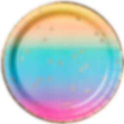 8 kpl kauniin värisiä lautasia, joita koristaa kultaiset folioyksityiskohdat. Lautasten halkaisija on 23 cm, ja ne on valmistettu pahvista.