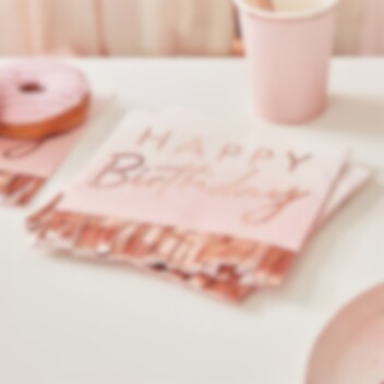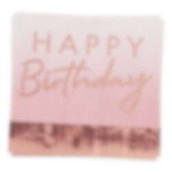 16 kpl servettejä Mix it Up -kokoelmasta vaaleanpunaisen ombren värisinä ja folioiduilla ruusukultaisilla reunoilla ja tekstillä ''Happy Birthday''. Mainio tuote synttärijuhliin. Servetit ovat 2-kerroksisia ja kooltaan noin 33 x 33 cm taittamattomina.