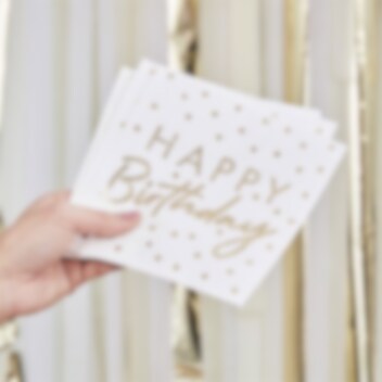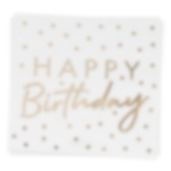 16 kpl kultafolioituja servettejä Mix it Up -kokoelmasta, joissa on teksti ''Happy Birthday'' toisella puolella valkoista taustaa vasten. Täydelliset lautasten alle synttäreillä tai muissa juhlissa. Servetit ovat 2-kerroksisia ja kooltaan noin 33 x 33 cm taittamattomina.