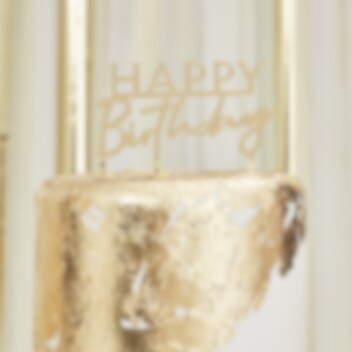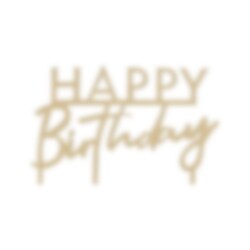 Kakkukoriste kultaisen värisenä, joka muodostaa tekstin ''Happy Birthday''. Mahtava koriste syntymäpäiväkakkuun. Koriste on noin 10 cm korkea.