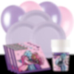 Valmis juhlasetti, joka sisältää laventelinväriset pahvilautaset (22,5 cm), Monster High -pahvimukit (200 ml) ja Monster High -servetit (33 x 33 cm) 8 tai 16 hengelle sekä 10 vaaleanpunaista ja 10 vaaleanviolettia ilmapalloa sekä mustan muovipöytäliinan (137 x 274 cm).