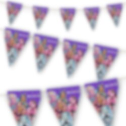 Värikäs lippuviirinauha pahvista hienoilla Monster High -kuvilla! Täydellinen koriste juhliin. Viirinauha on noin 3 metriä pitkä ja jokainen viiri on noin 24,5 cm korkea.