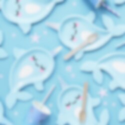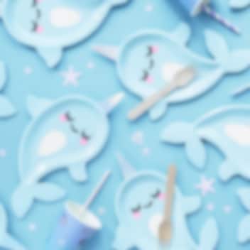 6 kpl pahvilautasia pienen sinisen sarvivalaan muodossa. Todella suloinen yksityiskohta synttärikattaukseen. Lautaset ovat kooltaan noin 18,5 x 29 cm.