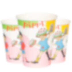 8 kpl. pahvimukeja värikkäillä kuvioilla Astrid Lindgrenin Peppi Pitkätossusta. Mukit ovat noin 10 cm korkeita ja niihin mahtuu noin 250 ml.