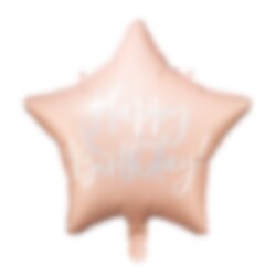 Söpö vaaleanpunainen, tähdenmuotoinen folioilmapallo tekstillä "Happy Birthday". Ilmapallo on halkaisijaltaan noin 40 cm täytettynä, ja se voidaan täyttää tavallisella ilmalla ilmapallopumpun avulla tai heliumilla, jos haluat sen leijuvan ilmassa.