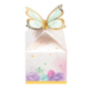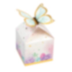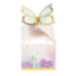 8 kpl eksklusiivisia juhlabokseja kauniissa väreissä ja pastellivärisellä perhosella, jossa kullanväriset folioyksityiskohdat. Täydellinen makeisten ja yllätysten pakkaamiseen juhliin. Juhlaboksit ovat kooltaan 12 x 10 cm. Valmistettu pahvista.