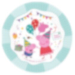 8 kpl pahvilautasia, joissa on värikäs kuva Pipsa Possusta ja hänen veljestään Jyristä juhlimassa syntymäpäivää. Täydelliset luomaan hauska juhlakattaus. Lautasten halkaisija on 23 cm.