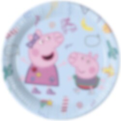 8 kpl värikkäitä pahvilautasia, joissa on kuva Pipsa Possusta. Lautasten läpimitta oli 23 cm.