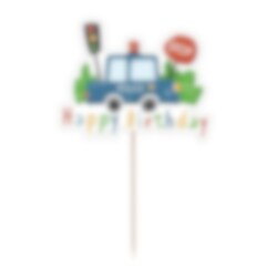 Cake Topper, jossa on poliisiauto ja teksti "Happy Birthday" kirkkain värein. Korkeus 19 cm.