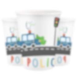 6 kpl. pahvimukeja poliisikuviolla. Mukit ovat 9 cm korkeita ja niiden tilavuus 200 ml.