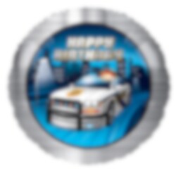 Pyöreä foliopallo hauskalla poliisiaiheisella kuvalla. Foliopallon halkaisija on täytettynä noin 45 cm.