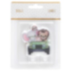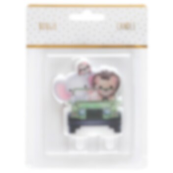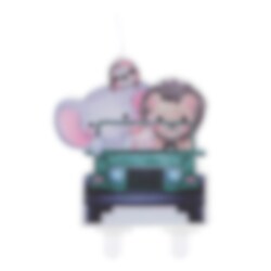Suloinen kakkukynttilä, jossa on autoa ajava safarieläin. Kakkukynttilän koko on noin 6,4 x 7,5 cm.
