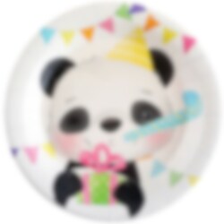 10 valkoista pahvilautasta söpöllä pandakuviolla ja juhlallisilla yksityiskohdilla. Täydellinen pandateemaisiin juhliin. Lautasten halkaisija on 22,5 cm.