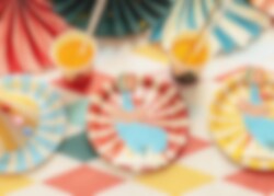 Kata värikäs juhlapöytä näillä sirkusteemaisilla lautasilla! Klassiset punaiset, keltaiset, siniset ja valkoiset raidat sekä kimaltelevat kultaiset tähtiyksityiskohdat. Lautauset antavat kattaukselle leikkisän ja juhlavan tunnelman. Lautaset ovat 18 x 18 cm kokoisia ja täydellisiä alkupaloille, kakulle tai muille herkuille. Myydään 6 kpl paketeissa.