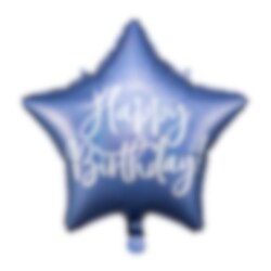 Söpö sinisen värinen, tähdenmuotoinen folioilmapallo tekstillä "Happy Birthday". Ilmapallo on halkaisijaltaan noin 40 cm täytettynä,ja se voidaan täyttää tavallisella ilmalla ilmapallopumpun avulla tai heliumilla, jos haluat sen leijuvan ilmassa.