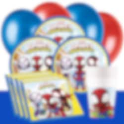 Valmis juhlasetti, joka sisältää lautaset (23 cm), pahvimukeja (200 ml) ja servetit (33 x 33 cm) 8:lle, 16:lle tai 24:lle henkilölle. Näiden lisäksi mukaan kuuluu 10 kpl tummansinisiä ja 10 kpl punaisia ilmapalloja sekä tummansininen muovinen pöytäliina ( 137 x 274 cm). 24 henkilön settiin kuuluu 2 pöytäliinaa.