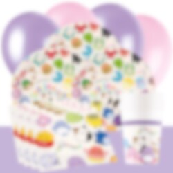 Settiin kuuluu myös 10 vaaleanpunaista ja 10 vaaleanviolettia ilmapalloa, jotka luovat juhlallisen tunnelman, sekä käytännöllinen vaaleanvioletti muoviliina (137 x 274 cm).