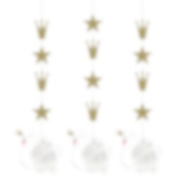 3 kpl riippuvia koristeita valkoisella joutsenteemalla sekä kultaisilla tähdillä ja kruunuilla. Sopiva koriste ripustettavaksi Stylish Swan -teemaisille synttäreille. Koristeiden pituus on noin 91 cm ja koristeiden koko on noin 18 cm.