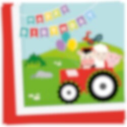 20 servettiä, joissa on söpöjä maatilan eläimiä ja värikäs viiri, jossa on teksti "Happy Birthday". Servetit ovat 2-kerroksisia ja niiden koko on 33 x 33 cm auki taitettuna.