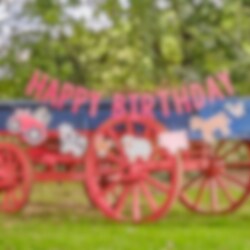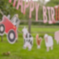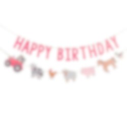 Hieno viirinauha, jossa on teksti "Happy Birthday" ja eri maatilan eläimiä. Viirinauha on valmistettu pahvista ja sen pituus on 4 metriä.