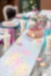 Värikäs kaitaliina, joissa on söpön yksisarvisen kuvio ja pieniä yksityiskohtia, kuten sydämiä ja tähtiä. Hieno koriste lasten yksisarvisteemaisten syntymäpäiväjuhlien kattaukseen.