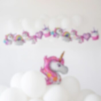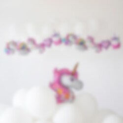 Hieno ilmapallokoriste yksisarvisteemalla – täydellinen yksisarvisjuhliin! Viirinauha on 206 cm pitkä ja jokaisen ilmapalon koko on noin 34 cm. Ilmapalloissa on itsestään sulkeutuva venttiili. Voit täyttää sen ilmapallopumpulla tai mukana tulevalla pillillä.